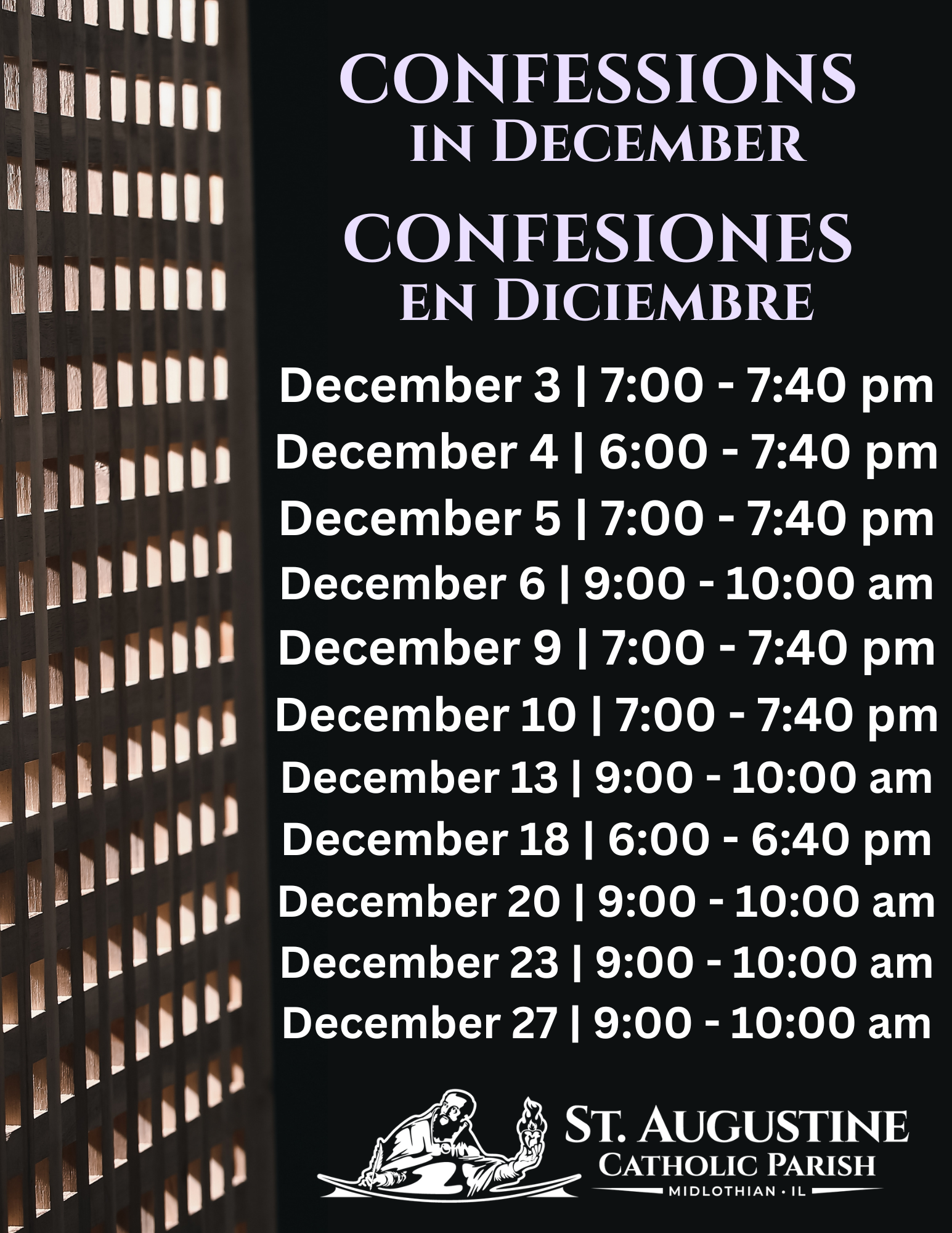 Our regular reconciliation is every Saturday from 9:00 AM to 10:00 AM, and on Thursdays from 6:00 PM to 6:40 PM. The reconciliation room is located in the front-west vestibule of the church.
